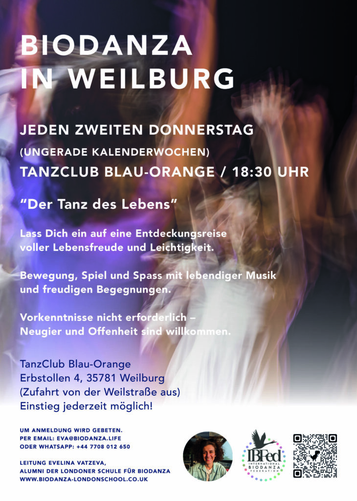 ab dem 11. September 2025 bieten wir regelmäßig Biodanza unter der Leitung von Evelina Vatzeva an. Das Training findet alle zwei Wochen, (d.h. ‚ungeraden Kalenderwochen‚) jeweils ab 18:30 Uhr statt.